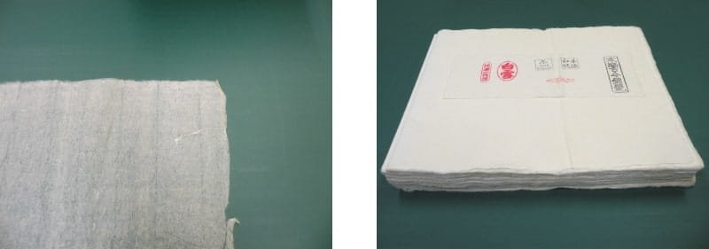 薄美濃紙は、乾湿による伸縮が少なく、強度に優れ、紙面が均一で美しいことが特徴です。 こうした性質から、表装では作品(本紙)に最初に施す裏打ちである「肌裏打ち」に多く用いられます。